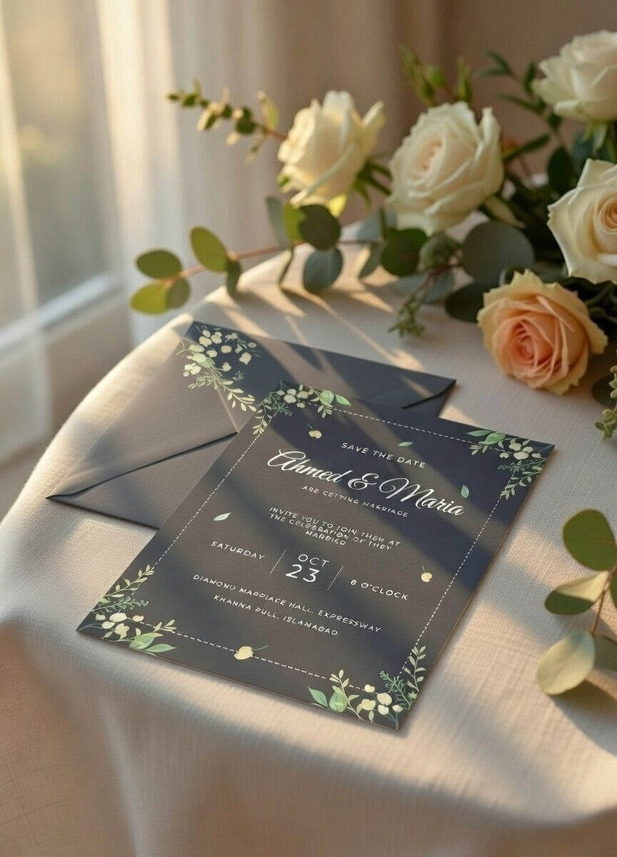 Elegant midnight navy invitation featuring delicate eucalyptus, white blossoms, and soft greenery. Perfect for romantic, modern, moody weddings. Includes matching envelope. Fully customizable digital or printed option.